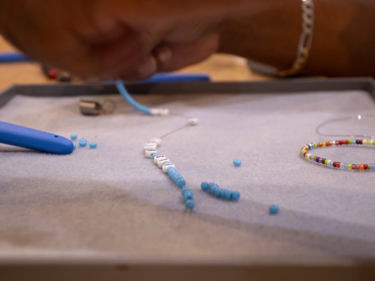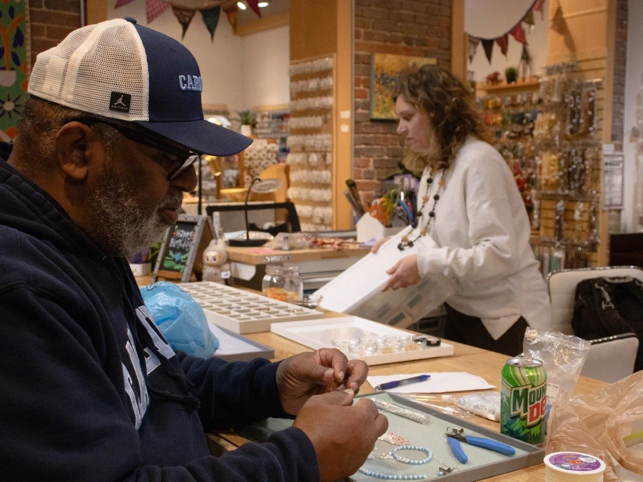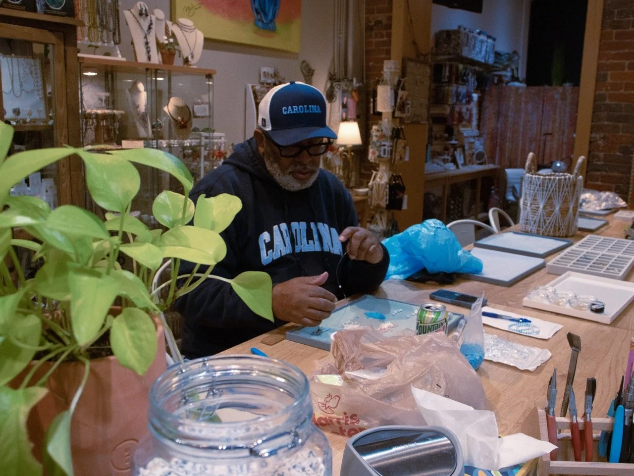 In his spare time, Willie Ray works on beaded bracelets at Firefly Bead Store in Carrboro, NC. This weekly tradition is one he's kept up for years, crafting pieces to give to friends, Carolina fans, and anyone he meets along the way. Store owner Mel has watched him become one of Firefly's most loyal regulars.